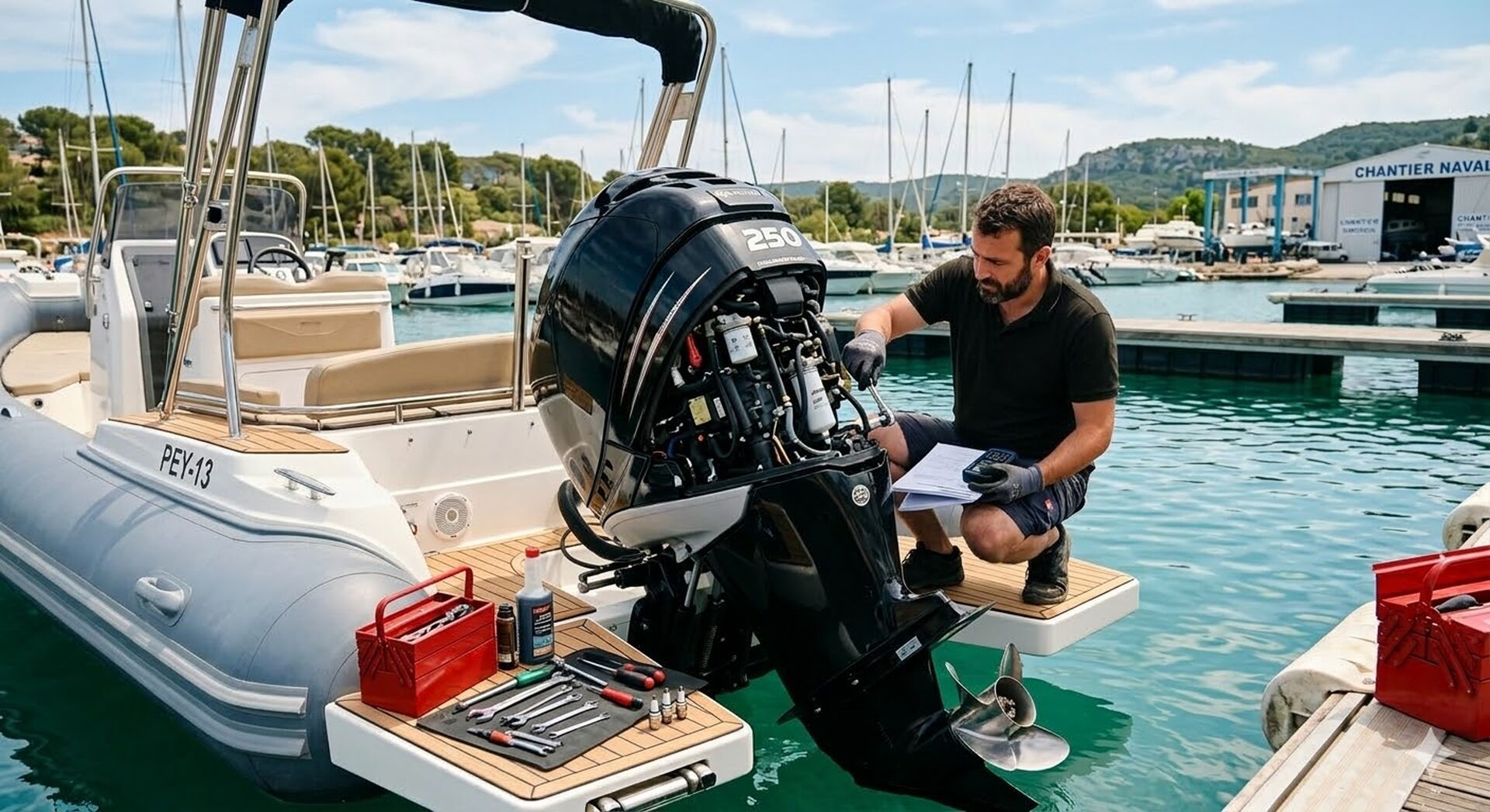 À Six-Fours-les-Plages, Le Brusc Marine met en avant la révision moteur hors-bord dans son atelier, avec prise en charge de l’entretien annuel, du diagnostic électronique, du remplacement d’hélice et des vérifications électriques sur bateaux rigides et semi-rigides.